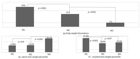 Statistical analysis was conducted using SPSS (11.0 for Windows; SPSS Inc., Chicago, IL, USA). The data are expressed as mean ± standard deviation, median (min. and max.), and frequency (%), as and when appropriate. The qualitative data were compared using the χ2 test and Fisher’s exact test. The continuous variables were tested for normality. Repeated measurements were used to evaluate the weight percentiles, BWDs, and TWPs at M1, M2, and M3; the test was chosen on the basis of the sphericity assumption. If sphericity was not assumed, the Greenhouse–Geisser method was employed. After repeated measurements, a pairwise comparison of the two groups was performed using the least significant difference (LSD) test. Intergroup comparisons of the BWDs among the different Quintero stages were performed using a one-way analysis of variance (ANOVA), followed by post hoc least significance difference (LSD) tests for multiple comparisons. The homogeneity of the variances was tested. The McNemar test for related samples was used to investigate the IUGR incidences among donor twins at M1, M2, and M3. Student’s t-test and the Mann–Whitney U test were used to compare the continuous variables between the groups according to the normality of the data. We examined the normality of the data distribution using the Shapiro–Wilk test. A probability value of less than 0.05 was considered statistically significant.