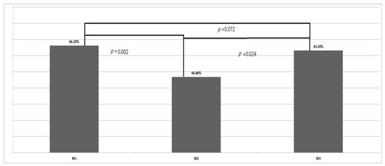 The TWPs at M1, M2, and M3 were 66.2%, 46.8%, and 63.2%, respectively, with the difference among the three measurements being significant (p = 0.02, repeated measurements, Figure 3). The TWPs decreased significantly from M1 to M2 (p = 0.002, LSD test) and then increased significantly from M2 to M3 (p = 0.024, LSD test). However, a significant difference was not found in the TWPs between M1 and M3 (p = 0.72, LSD test).