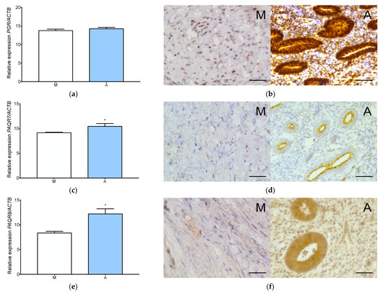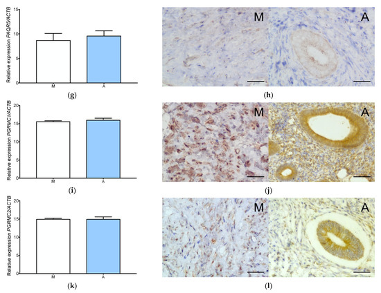 Progesterone receptors expression in adenomyosis and normal myometrium. Characterization of PGR expression at gene (a) and protein (b) level, PAQR7 gene (c) and protein (d) level, PAQR8 gene (e) and protein (f) level, PAQR5, gene (g) and protein (h) level, PGRMC1 gene (i) and protein (j) level and PGRMC2 gene (k) and protein (l) level. The columns represent the ratio of the expression of the gene tested and ACTB ± SEM. Asterisk indicates significant differences (* p ≤ 0.05). Original magnification, 40×; scale bar, 50 μm. A, adenomyosis; M, myometrium.