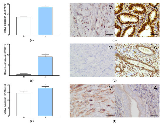 Estrogen receptors expression in adenomyosis and normal myometrium. Characterization of ESR1 expression at gene (a) and protein (b) level, ESR2 expression at gene (c) and protein (d) level and GPER expression at gene (e) and protein (f) level in myometrium and adenomyosis. Each column represents the ratio of the expression of investigated gene and ACTB ± SEM. Asterisk indicates significant differences (* p ≤ 0.05). Original magnification, 40×; scale bar, 50 μm. A, adenomyosis; M, myometrium.