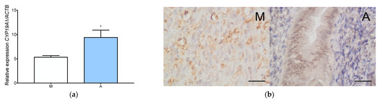 Aromatase expression in adenomyosis and normal myometrium. RT-qPCR analysis of CYP19A1 expression level in myometrium and adenomyosis (a). Each column represents the ratio of the expression of investigated gene and ACTB ± SEM. Asterisk indicates significant differences (* p ≤ 0.05). Immunohistochemical localization of aromatase in adenomyosis and normal myometrium (b). Original magnification, 40×; scale bar, 50 μm. A, adenomyosis; M, myometrium.