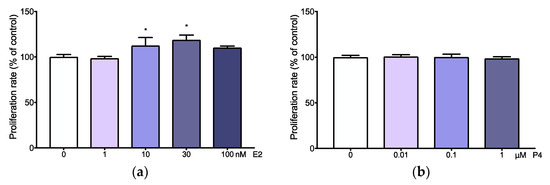 Adenomyotic cell proliferation was significantly increased after stimulation with 10 or 30 nM of estradiol (Figure 4a). Other concentrations of estradiol (1 and 100 nM) did not affect adenomyosis cell proliferation (Figure 4a). Similarly, none the concentrations of progesterone (0.01–1 µM) had an effect on adenomyotic cell proliferation (Figure 4b).