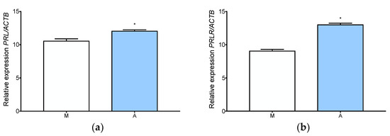 Prolactin and prolactin receptor expression in adenomyosis and normal myometrium. RT-qPCR analysis of PRL (a) and PRLR (b) expression of level in myometrium and adenomyosis. Each column represents the ratio of the expression of investigated gene and ACTB ± SEM. Asterisks indicate significant differences (* p ≤ 0.05). M, myometrium; A, adenomyosis.
