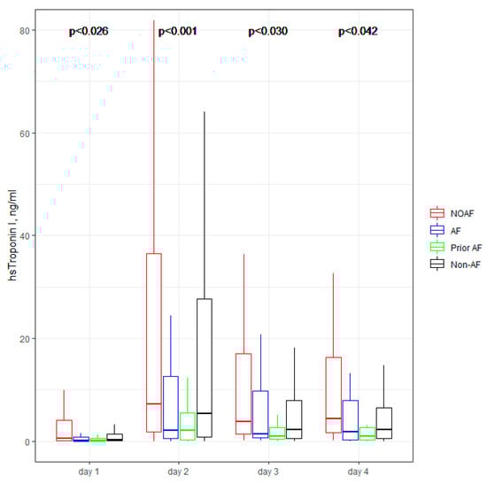 hsTnI concentration within the first four days of hospitalization. The center represents the median value. The upper and lower quartiles values are displayed with whiskers. p-values on the figure represent the group changes (the Kruskal–Wallis test). The time changes were calculated by the Friedman test and paired samples Wilcoxon test with Bonferroni adjusted (p < 0.001). hsTnI—high sensitivity troponin I; NOAF—group of patients with any newly diagnosed AF that appeared during AMI hospitalization; AF—group of patients with a previously documented diagnosis of AF who additionally had AF during AMI hospitalization; Prior AF—group of patients with a previously documented diagnosis of AF who had not developed AF during AMI hospitalization; Non-AF—group of patients with no evidence of AF during AMI hospitalization and without the prior AF diagnosis.