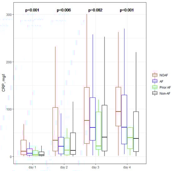 CRP concentration within the first four days of hospitalization. The center represents the median value. The upper and lower quartiles values are displayed with whiskers. p-values on the figure represent the group changes (the Kruskal–Wallis test). The time changes were calculated by the Friedman test and paired samples Wilcoxon test with Bonferroni adjusted (p < 0.001). CRP—C-reactive protein; NOAF—group of patients with any newly diagnosed AF that appeared during AMI hospitalization; AF—group of patients with a previously documented diagnosis of AF who additionally had AF during AMI hospitalization; Prior AF—group of patients with a previously documented diagnosis of AF who had not developed AF during AMI hospitalization; Non-AF—group of patients with no evidence of AF during AMI hospitalization and without the prior AF diagnosis.