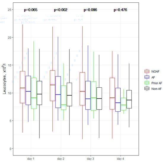 Leucocytes within the first four days of hospitalization. The center represents the median value. The upper and lower quartiles values are displayed with whiskers. p-values on the figure represent the group changes (the Kruskal–Wallis test). The time changes were calculated by the Friedman test and paired samples Wilcoxon test with Bonferroni adjusted (p < 0.001). NOAF—group of patients with any newly diagnosed AF that appeared during AMI hospitalization; AF—group of patients with a previously documented diagnosis of AF who additionally had AF during AMI hospitalization; Prior AF—group of patients with a previously documented diagnosis of AF who had not developed AF during AMI hospitalization; Non-AF—group of patients with no evidence of AF during AMI hospitalization and without the prior AF diagnosis.