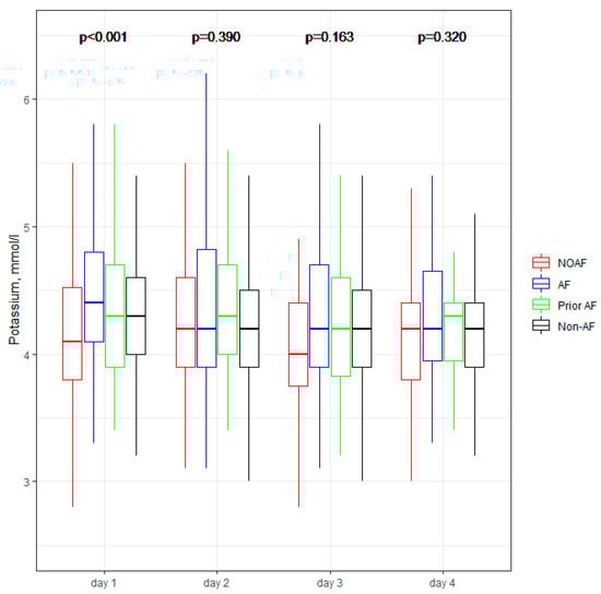 Potassium concentration within the first four days of hospitalization. The center represents the median value. The upper and lower quartiles values are displayed with whiskers. p-values on the figure represent the group changes (the Kruskal–Wallis test). The time changes were calculated by the Friedman test and paired samples Wilcoxon test with Bonferroni adjusted (p < 0.004). NOAF—group of patients with any newly diagnosed AF that appeared during AMI hospitalization; AF—group of patients with a previously documented diagnosis of AF who additionally had AF during AMI hospitalization; Prior AF—group of patients with a previously documented diagnosis of AF who had not developed AF during AMI hospitalization; Non-AF—group of patients with no evidence of AF during AMI hospitalization and without the prior AF diagnosis.