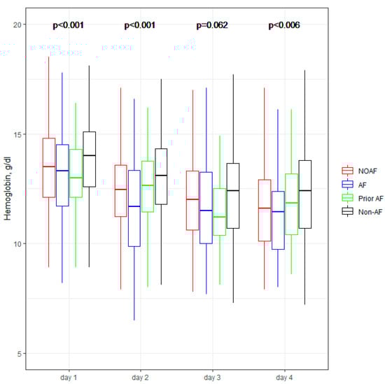 Hemoglobin within the first four days of hospitalization. The center represents the median value. The upper and lower quartiles values are displayed with whiskers. p-values on the figure represent the group changes (the Kruskal–Wallis test). The time changes were calculated by the Friedman test and paired samples Wilcoxon test with Bonferroni adjusted (p < 0.001). NOAF—group of patients with any newly diagnosed AF that appeared during AMI hospitalization; AF—group of patients with a previously documented diagnosis of AF who additionally had AF during AMI hospitalization; Prior AF—group of patients with a previously documented diagnosis of AF who had not developed AF during AMI hospitalization; Non-AF—group of patients with no evidence of AF during AMI hospitalization and without the prior AF diagnosis.