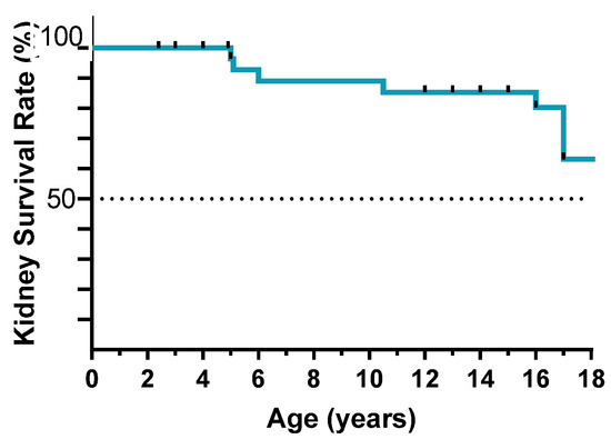 The median follow-up from diagnosis of kidney disease was 9 years (IQR 3–13), with a median age at last observation of 15 years (IQR 13–15.2), 63% of patients reach adulthood (18 years of age) with preserved kidney function (Figure 2) and 55% had normal kidney function at the last follow-up. Seventeen patients progressed to kidney failure during the follow-up within the third decade of life. The median age at ESRD was 17 years (IQR 9.3–20). At the last follow-up, 13 patients had received a kidney transplant (one of them received two kidney transplants due to graft lost for chronic transplant glomerulopathy of the first graft), whereas 5 patients were in dialysis (peritoneal dialysis or hemodialysis). As expected, disease recurrence in the allograft was never observed.