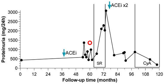 When proteinuria exceeded 500 mg/24 h the patient started ACEi (Enalapril 5 mg daily) (blue arrow). Due to worsening of proteinuria, a kidney biopsy was performed at month 60 (red circle), with the diagnosis of focal segmental glomeruloscelrosis. The patient received 8-months course of oral steroids without benefit. The dose of ACEi was doubled at month 73 (blue arrow) and the proteinuria set around 600–700 mg/24 h. The patient started cyclosporine (150 mg daily) at month 98 (CyA brackets) and over 11 months the proteinuria decreased below 200 mg/24 h (190 mg/24 h at last follow-up).