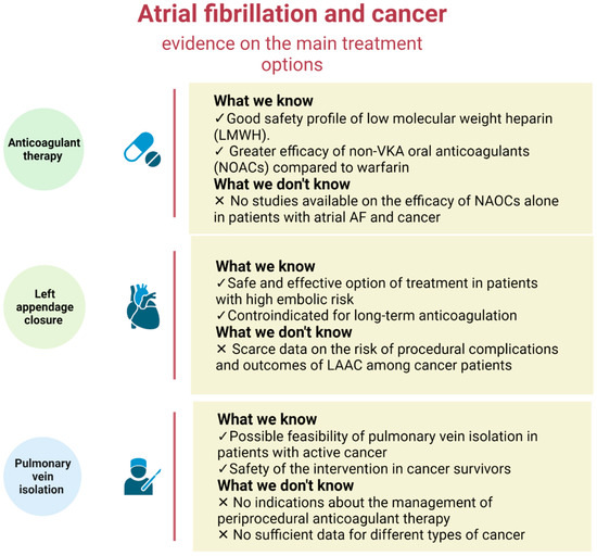 Overview of possible therapeutic strategies for atrial fibrillation in cancer patients. The main therapeutic strategies used to treat atrial fibrillation have only been partially explored in the cancer patient. Although a number of studies have advanced our knowledge of how to manage the oncological patient with atrial fibrillation, there are still a fair number of questions that have not yet been fully answered. Created with Biorender.com (accessed on 13 July 2022).