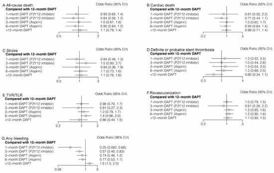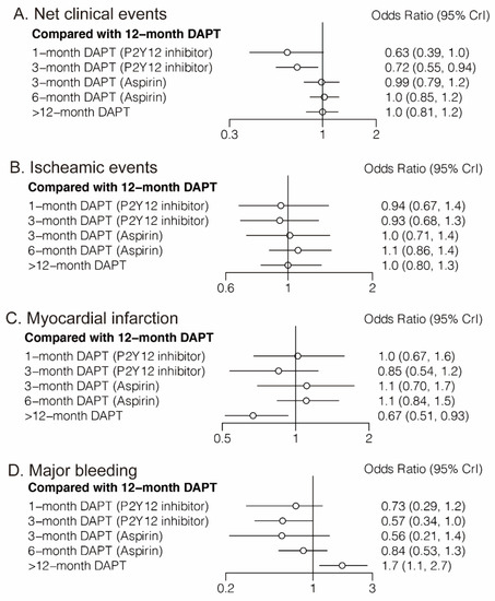 Eighteen (51,551) randomized trials reported 1631 (3.16%) (any) bleeding events. Six-month DAPT (aspirin) significantly increased the risk of any bleeding compared with 1-month DAPT (P2Y12 inhibitor) (OR: 3.09; CrI: 1.07–9.82), 12-month DAPT significantly increased the risk of any bleeding compared with both 1-month DAPT (P2Y12 inhibitor) (OR: 3.99; CrI: 1.46–12.23) and 3-month DAPT (P2Y12 inhibitor) (OR: 1.74; CrI: 1.20–2.49), and >12-month DAPT significantly increased the risk of any bleeding compared with any DAPT strategies (Table 2).