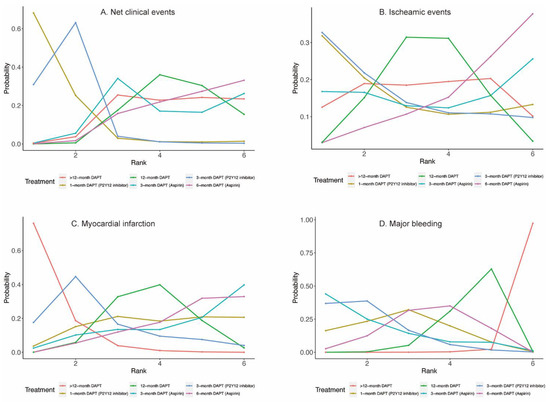 The better prognosis associated with 3-month DAPT (P2Y12 inhibitor) could be explained by several plausible reasons. First, it is reported that P2Y12 inhibitor monotherapy inhibited hemostatic system activation to a comparable extent relative to DAPT [41], yet aspirin alone provided little additional inhibition of platelet aggregation in the presence of a P2Y12 inhibitor [42]. At the same time, P2Y12 inhibitor monotherapy is not associated with a higher risk of cerebrovascular events than DAPT [10]. Second, the risk of bleeding was significantly lower with P2Y12 inhibitor monotherapy than with DAPT. Reducing bleeding after PCI is of great significance, as bleeding has a strong association with subsequent all-cause death and major adverse cardiovascular events, approximating or even exceeding that associated with myocardial infarction [6,43]. Third, as observed in the present network meta-analysis, most patients were treated with new-generation DESs. Several studies have reported significant decreases in all-cause death and myocardial infarction with new-generation DESs compared with first-generation DESs. The risk of definite or probable stent thrombosis is also on average 50% lower with new-generation DESs [44,45]. Given the very low rate of stent thrombosis (0.60%) and relatively high rate of major bleeding (1.28%) in the present meta-analysis, reducing major bleeding with short-term DAPT may be more important than attempting further reduction of stent thrombosis with intensive DAPT. In this context, it seems that 3-month DAPT followed by P2Y12 inhibitor monotherapy might be an attractive option after implantation of current-generation DESs, as it is not associated with an increased ischemic events while reducing bleeding events. Similarly to our findings, the newly published 2021 ACC/AHA guidelines recommend that in selected patients receiving PCI, shorter-term DAPT (1–3 months) followed by P2Y12 inhibitor monotherapy is reasonable in reducing the risk of bleeding (Class IIa, Level A) [16]. In our network meta-analysis, we further demonstrated that the benefit was more evident in the 3-month DAPT (P2Y12 inhibitor) group than in the 1-month DAPT (P2Y12 inhibitor) group.