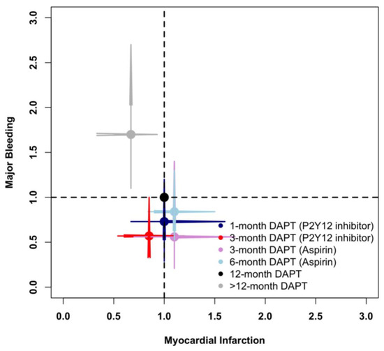 Figure 6 illustrates the risks of myocardial infarction and major bleeding of different DAPT strategies compared with standard 12-month DAPT. Overall, >12-month DAPT decreased myocardial infarction at the expense of increased major bleeding, whereas 3-month DAPT (P2Y12 inhibitor) decreased major bleeding without increasing myocardial infarction events.