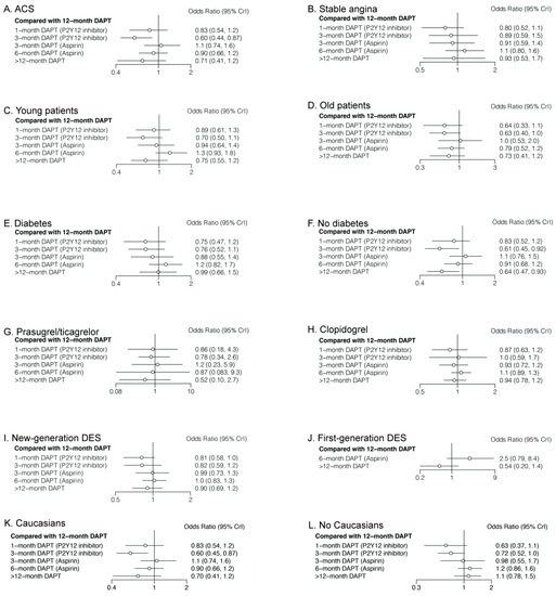 As shown in Table 3 and Figure 7, in patients with ACS, both 3-month DAPT (aspirin) (OR: 1.76; CrI: 1.05–2.87) and 12-month DAPT (OR: 1.67; CrI: 1.15–2.25) significantly increased primary outcomes compared with 3-month DAPT (P2Y12 inhibitor). However, no significant differences were observed in patients with stable angina. In young patients, 6-month DAPT (aspirin) was associated with a higher risk of primary outcome compared with 3-month DAPT (P2Y12 inhibitor) (OR: 1.78; CrI: 1.09–2.93), whereas >12-month DAPT significantly reduced primary outcomes compared with 6-month DAPT (aspirin) (OR: 1.78; CrI: 1.09–2.93). No significant difference was observed in old patients or patients with diabetes. However, in patients without diabetes, 3-month DAPT (P2Y12 inhibitor) was associated with a lower risk of primary outcomes compared with both 3-month DAPT (aspirin) (OR: 0.57; CrI: 0.37–0.98) and 12-month DAPT (OR: 0.61; CrI: 0.45–0.92). There were no significant differences in primary outcomes between any comparison of DAPT strategies in patients receiving prasugrel/ticagrelor, clopidogrel, or new-generation DESs. In patients receiving first-generation DESs, 6-month DAPT (aspirin) significantly increased primary outcomes compared with >12-month DAPT (OR: 4.63; CrI: 1.05–21.99). Three-month DAPT (P2Y12 inhibitor) was consistently beneficial, regardless of population origin.