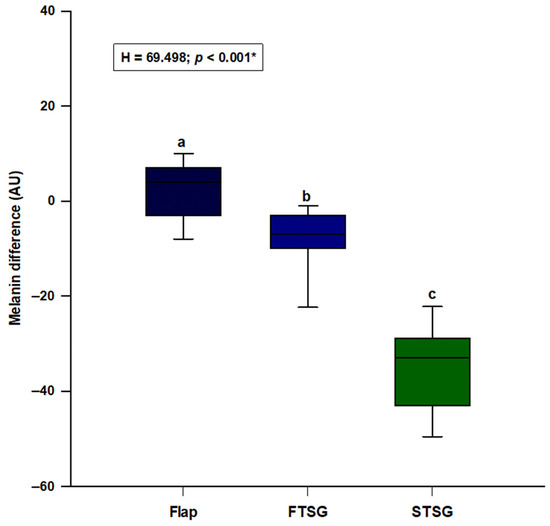 Comparison of the melanin difference between the random local flaps (N = 31), STSG (N = 30) and FTSG (N = 30) groups. Abbreviations: FTSG—full-thickness skin graft; STSG—split-thickness skin graft. * Kruskal–Wallis test with post hoc Dunn’s test. a vs. b—p < 0.05; a vs. c—p < 0.05; b vs. c—p < 0.05.