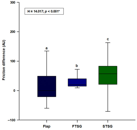 We observed a statistically significant difference in friction (H = 14.017; p < 0.001), with the random skin flap group showing the lowest difference and the STSG group presenting the highest difference (flaps: 0.0 (−21.0—49.0); FTSGs: 20.0 (15.0—40.0); STSGs: 51.0 (21.0—83.0)) (Figure 5). Post hoc analysis showed a significant difference between random skin flaps and STSGs (p < 0.05) (Figure 5).