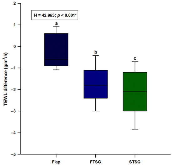 Comparison of the TEWL difference between the random local flaps (N = 31), STSG (N = 30) and FTSG (N = 30) groups. Abbreviations: FTSG—full–thickness skin graft; STSG—split-thickness skin graft; TEWL—transepidermal water loss. * Kruskal–Wallis test with post hoc Dunn’s test. a vs. b—p < 0.05; a vs. c—p < 0.05; b vs. c—p > 0.05.