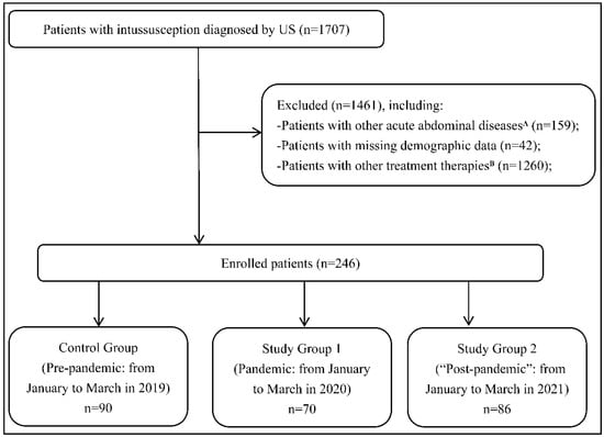 Flow chart of the present study. There were 1707 patients who were diagnosed with intussusception using US. We excluded 1461 patients who did not meet the inclusive criteria and ultimately enrolled 246 ones in this study. There were 90 patients in Control Group (pre-pandemic), 70 patients in Study Group 1 (pandemic), and 86 patients in Study Group 2 (“post-pandemic”). A: Refers to patients with intussusception combined with other acute abdominal diseases, such as appendicitis, pancreatitis, and intestinal obstruction of unknown origin. B: Refers to patients with intussusception receiving X-ray-guided pneumatic enema reduction, direct surgical treatment, and other non-invasive therapies. Note: US = ultrasound.