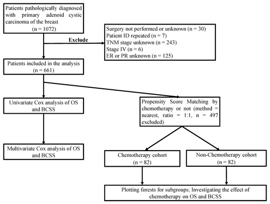 Patients who were initially diagnosed with ACCB between 1 January 1988 and 31 December 2015 were retrieved from the SEER database. The inclusion criteria were as follows: (1) cases of ACCB with histopathological confirmation; (2) patients receiving radical surgery; (3) adjusted American Joint Committee on Cancer (AJCC) 6th ed. stage I–III. We excluded cases of unperformed or unknown surgery, patients with duplicate patient ID (inconsistent information), patients with unknown TNM staging or stage IV, and those with unknown estrogen receptor (ER) or progesterone receptor (PR) status. The patient screening process is illustrated in Figure 1. The clinicopathological characteristics analyzed were age at diagnosis, sex, TNM staging, tumor size, lymph node, ER and PR status, histological grades, and treatment modalities (including radiotherapy/chemotherapy).