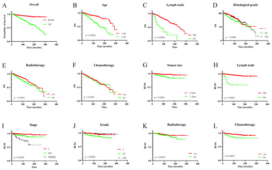 The OS and BCSS of overall population and different groups. (A): the OS and BCSS of the overall population; (B–F): the OS of different subgroups of age (B), lymph node (C), histological grade (D), radiotherapy (E), chemotherapy (F); (G–L): the BCSS of different subgroups of tumor size (G), lymph node (H), stage (I), grade (J), radiotherapy (K), chemotherapy (L).