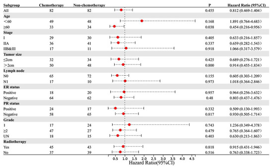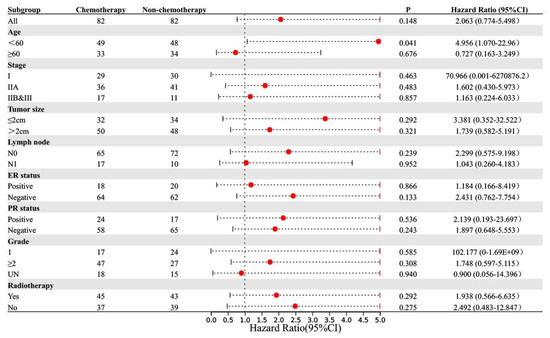 To explore the subgroups of patients who benefited from chemotherapy, we performed PSM for patients who received and did not receive chemotherapy. Through neighbor matching, no statistically significant difference was found between the chemotherapy and non-chemotherapy groups in terms of age at diagnosis, TNM stage, tumor size, lymph node metastasis status, ER status, PR status, and histological grade (Table 3). There was no statistically significant difference in OS and BCSS between these groups (OS: p = 0.455, BCSS: p = 0.148). The distribution graphs and histograms of propensity scores before and after matching are listed in Figures S1 and S2. The results are shown as forest plots of hazard ratios (HRs) and 95% confidence intervals (CIs) for OS and BCSS (Figure 3 and Figure 4). In the subgroup aged ≥60 years, chemotherapy prolonged OS (p = 0.038, HR: 0.454, 95% CI: 0.216–0.956). In the subgroup aged <60 years, the BCSS of the chemotherapy group was worse (p = 0.041, HR: 4.956, 95% CI: 1.07–22.96).