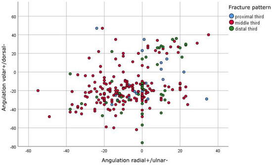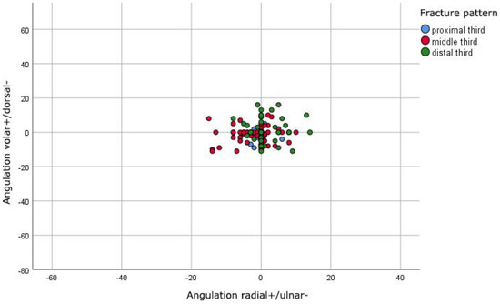 Figure 3. Comparison of fracture pattern and maximal postoperative angulations of diaphyseal radial fractures in degrees in both planes.