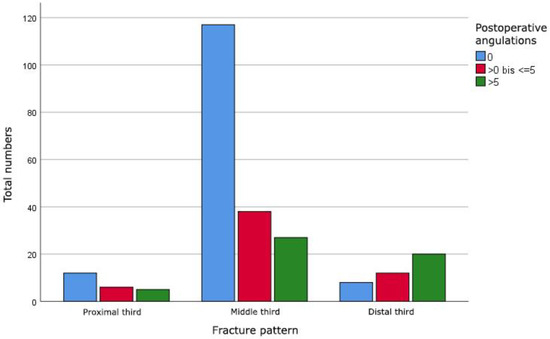 The postoperative radiographic measurements showed an expected improvement of the angulations, even though angulations up to 18 degrees in all planes could be found (Figure 2). In relation to the surgical approach, no significant difference (p = 0.129) was seen. However, we found a significant correlation (p < 0.001) between the fracture pattern and the postoperative angulations. Fractures in the distal diaphysis showed a significantly higher postoperative angulation compared to fractures in the proximal and middle diaphysis (Table 1, Figure 3).