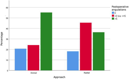 In 29 out of 40 fractures of the distal third of the diaphysis, the ESIN was performed through a dorsal approach, 11 fractures were operated on using a radial approach. No significant correlation (p = 0.414) between the approach and postoperative angulation of distal forearm and radial fractures was shown. A tendency towards the radial approach in terms of better maximal postoperative angulation in both planes and radiographic outcome was found (Figure 4).