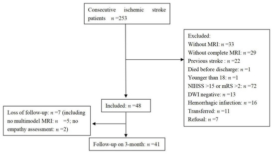 The present study had the following strengths. (1) We assessed the patients’ empathy after subacute ischemic stroke. (2) We used a comprehensive set of neuroimaging parameters obtained using a multimodal MRI protocol, including acute infarction, brain volumetry, white matter integrity, and other preexisting abnormalities. There were also some limitations to the study. First, the sample size was relatively small. Second, other social cognition domains were not evaluated, such as the theory of mind, perception and behavior. Third, the recruited patients had experienced relatively mild stroke, which may limit the generalizability of the current findings. Fourth, because the range of stroke subtypes was relatively limited, with only 5% of participants having atrial fibrillation, the representativeness of the sample may be insufficient to generalize the findings to all patients who experience stroke.