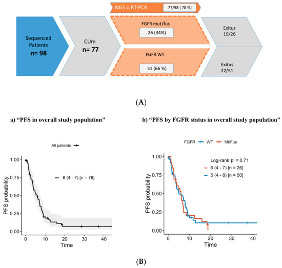 Median PFS after first-line treatment for the whole study population was 6 months in the FGFR mut/fus cohort and 5 months in the FGFR WT patient group (p = 0.71) (Figure 1B).