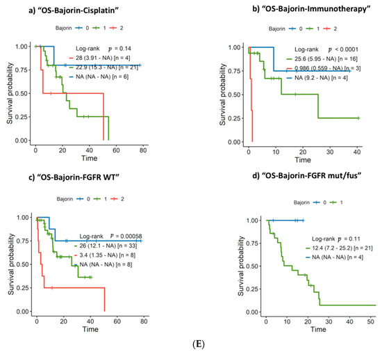 We aimed to analyze the validity of classical prognostic models in the study population, subdivided according to FGFR genomic alterations. First, we explored Bajorin’s model that considers visceral metastases and KPS < 80% as poor risk factors. Median OS in patients treated with first-line platinum-based chemotherapy with zero, one, or two risk factors were: not reached, 22.9, and 28 months, respectively (p = 0.14). The same analysis was performed in patients treated with first-line CPI with mOS: not reached, 25.6, and <1 month, respectively (p = 0.0001). When we analyzed Bajorin’s criteria according to FGFR status, they were fulfilled in FGFR WT patients (p = 0.00058) but did not reach statistical significance in FGFR GA patients (p = 0.11) (Figure 1E).