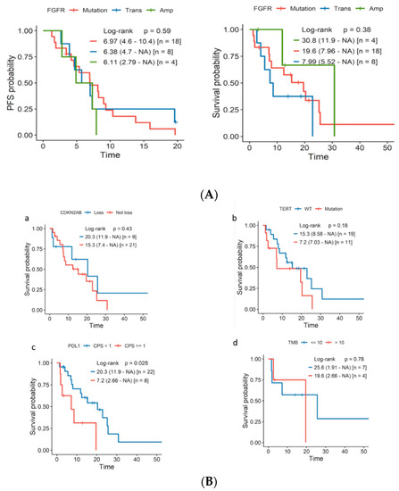 Subsequently, we analyzed the interactions between FGFR GAs, the potential molecular biomarkers of the response to CPI (PD-L1, TMB ), and other mutations of interest, including CDKN2A/B loss and TERT promoter mutations. Phi correlation matrixes were calculated, and a Venn diagram was constructed for 30 FGFR GA tumors to determine the association with clinical outcomes (Figure 2C,D).