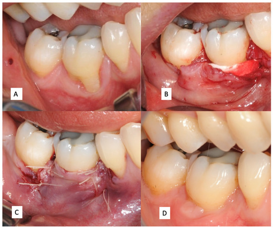 (A) Mucogingival defect of the first mandibular molar; (B) insertion of the xenogeneic collagen matrix; (C) flap suture; (D) healing of the surgical site after 6 months.