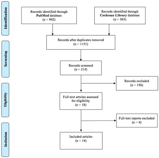 The electronic search through the PubMed database identified 902 publications, while the search using the Cochrane Library database identified 565 titles. Following the removal of all duplicates, 1151 articles were identified from 1998 to 2022. Among these, 214 publications were maintained for screening. After the reading of all abstracts, 18 studies positive for eligibility were read entirely (full-text). The reading of full-texts allowed for the exclusion of 4 articles with reason, so the electronic search identified 14 articles, whose data are reported in Table 1 [22,23,24,25,26,27,28,29,30,31,32,33,34,35,36]. A flow chart summarizing the study selection procedure was constructed in accordance with PRISMA guidelines (2009) (Figure 2).