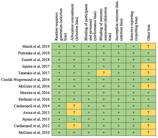 Six articles were classified as low risk of bias, while eight publications were classified as unclear risk of bias. In particular, with regard to “random sequence generation”, the risk of bias was adequate in all publications. “Allocation concealment” was generally performed using an opaque envelope containing the type of intervention that the operator had to perform on the patient: this envelope was opened only after the design of the flap on the treatment site. This risk of error was unclear in three articles. The blinding of participants to the type of intervention selected was not possible due to the nature of the intervention itself, which required either the execution of a second surgical site on the palate for collecting the connective graft or the use of the collagen matrix/CAF alone. The blinding of the staff in relation to the type of surgery performed was obviously not possible (the surgeon knows the type of intervention he is carrying out on the patient). Despite this, it is the opinion of the author that performance bias did not compromise the quality of the studies considered, as in oral surgery it is very difficult, if not impossible, to eliminate this bias. For these reasons, it was arbitrarily decided to consider all articles low-risk with regard to performance bias. Only one article [34] was classified as unclear risk of bias relative to “detection bias”. Despite some limited patient drop-outs (4 drop-outs), it is possible to state that there were no incomplete data. Furthermore, no errors were reported in reporting the results. As regards the “other bias” section, it was decided to attribute a risk of unclear bias to the articles in which the collagen matrix was subsidized by the manufacturer.