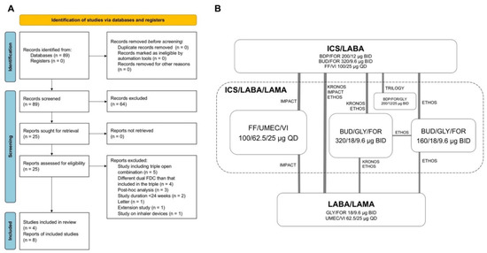 RCTs that enrolled COPD patients, lasting ≥24 weeks, and that included at least one arm assessing the impact of triple ICS/LABA/LAMA FDCs compared to the same dual FDC (either ICS/LABA or LABA/LAMA) as in the triple FDC and were administered via the same device were included in the quantitative analysis. Two reviewers independently examined the studies, and any difference in opinion concerning the selection of relevant RCTs from literature searches and databases was resolved by consensus.
