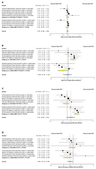 ICS/LABA/LAMA FDC did not increase the risk of total SAEs (overall RR 1.03, 95% CI 0.98–1.08) vs. dual FDC. However, ICS/LABA/LAMA FDC significantly increased the risk of CV SAEs (RR 1.29, 95% CI 1.10–1.51; p < 0.01) vs. ICS/LABA FDC and the risk of pneumonia (RR 1.66, 95% CI 1.42–1.94; p < 0.001) vs. LABA/LAMA FDC. ICS/LABA/LAMA FDC also significantly reduced the risk of all-cause mortality (RR 0.75, 95% CI 0.58–0.96; p < 0.05) vs. LABA/LAMA FDC (Figure 3A–D).