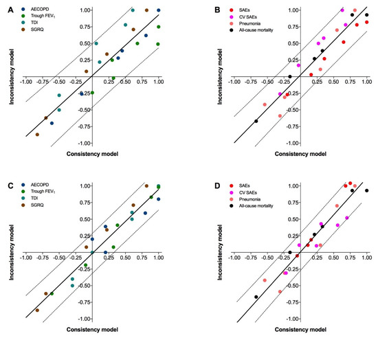 Assessment of the risk of bias via the consistency/inconsistency regression with 95% prediction bands concerning the efficacy (A) and safety (B) outcomes and after sensitivity analysis (C,D) by excluding the treatment comparisons introducing inconsistency in the Bayesian network. AECOPD: acute exacerbation of COPD; CV: cardiovascular; FEV1: forced expiratory volume in the first second; SAE: serious adverse event; SGRQ: St. George’s Respiratory Questionnaire; TDI: transitional dyspnea index.