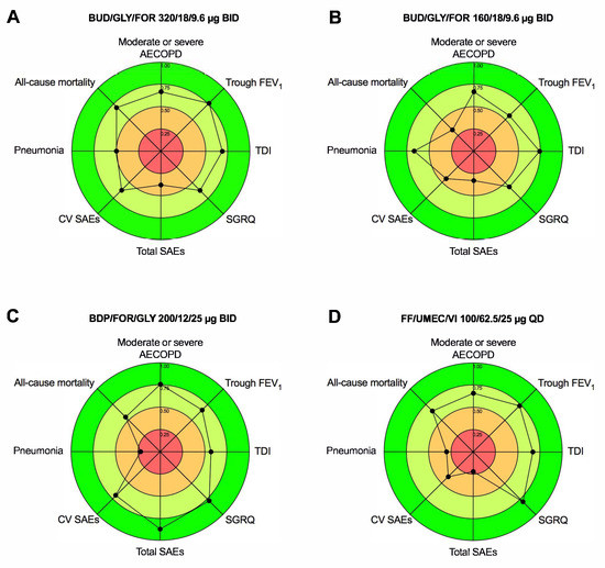 Graphical representation of combined efficacy/safety profile of BUD/GLY/FOR 320/18/9.6 µg BID (A), BUD/GLY/FOR 160/18/9.6 µg BID (B), BDP/FOR/GLY 200/12/25 µg BID (C), and FF/UMEC/VI 100/62.5/25 µg QD (D) in COPD patients according to the IBiS score; a greater area indicates a better efficacy/safety profile. AECOPD: acute exacerbation of COPD; BDP: beclomethasone dipropionate; BID: bis in die, twice daily; BUD: budesonide; COPD chronic obstructive pulmonary disease; CV: cardiovascular; FDC: fixed-dose combination; FEV1: forced expiratory volume in the first second; FF: fluticasone furoate; FOR: formoterol fumarate; GLY: glycopyrronium bromide or glycopyrrolate; ICS: inhaled corticosteroid; IBiS: Implemented Bidimensional SUCRA; LABA: long-acting β2-adrenoceptor agonist; LAMA: long-acting muscarinic antagonist; QD: quaque die, once daily; SAEs: serious adverse events; SGRQ: St. George’s Respiratory Questionnaire; SUCRA: surface under the cumulative ranking curve; TDI: transitional dyspnea index; UMEC: umeclidinium bromide; VI: vilanterol.