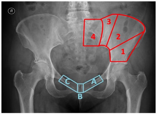 The classification system was based on where the proximal osteotomy and the distal osteotomy were made at the time of surgery to achieve wide margins resection. We defined 4 regions in the super acetabular area (Figure 1) in which the proximal osteotomy had been performed in the different cases. Region 1 was contained between the roof of the acetabulum and a line that connects the apex of the greater sciatic notch and the anterosuperior iliac spine. Region 2 was comprised of the area between the anterosuperior iliac spine and the lateral margin of posterosuperior iliac spine. Region 3 was the area in between the lateral margin of the posterosuperior iliac spine bone and the sacroiliac joint. Region 4 included the sacroiliac joint, and thus, it was placed in the sacral wing. For the distal (medial) osteotomy, we identified three osteotomy locations: type A osteotomy involved the ipsilateral pubic ramus, type B osteotomy was in the pubic symphysis and type C involved the contralateral pubic ramus.