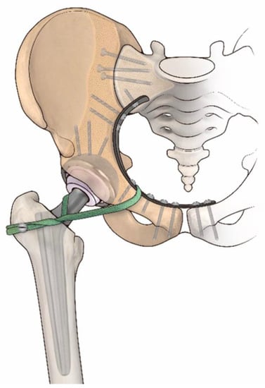 - Brown, T.S.; Salib, C.G.; Rose, P.S.; Sim, F.H.; Lewallen, D.G.; Abdel, M.P. Reconstruction of the Hip after Resection of Periacetabular Oncological Lesions: A Systematic Review. Bone Jt. J. 2018, 100-B, 22–30. [Google Scholar] [CrossRef]