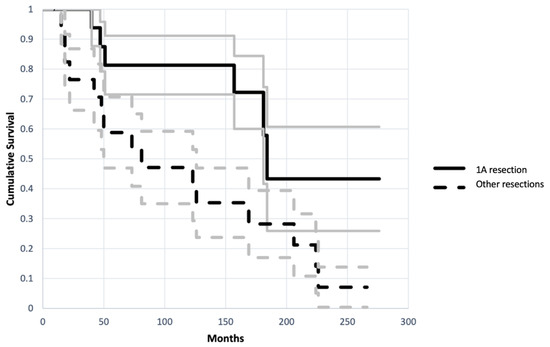 Kaplan-Meier plot shows different cumulative survival in Group 1 (A1 resection) and in Group 2 (Other resections) (CI 95%, p = 0.02). Endpoint of analysis was at least one surgical operation for revision of implant due to mechanical failure (aseptic loosening, fracture or resorption of the allograft, dislocation or breakage of the hardware). Grey lines represent standard deviation.