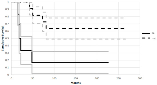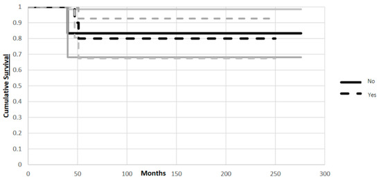 Kaplan-Meier plot shows similar survival rate in Group 1 with ligament in the reconstruction (Yes) or without artificial ligament in the reconstruction (No), at 120 months (CI 95%, p = 0.02). The endpoint of analysis was at least one surgical operation for revision of implant due to mechanical failure (aseptic loosening, fracture or resorption of the allograft, dislocation or breakage of the hardware). Grey lines represent standard deviation.