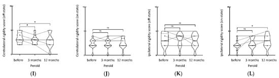Shows the tremor, bradykinesia, rigidity part of MDS-UPDRS score (on/off state) of contralateral and ipsilateral limbs pre-operation, 3 months, and 12 months post-operation, respectively. (A) Contralateral tremor score (off state), (B) contralateral tremor score (on state), (C) ipsilateral tremor score (off state), (D) ipsilateral tremor score (on state). (E) Contralateral bradykinesia score (off state), (F) contralateral bradykinesia score (on state), (G) ipsilateral bradykinesia score (off state), (H) ipsilateral bradykinesia score (on state). (I) Contralateral rigidity score (off state), (J) contralateral rigidity score (on state), (K) ipsilateral rigidity score (off state), (L) ipsilateral rigidity score (on state). ** p< 0.01, * p < 0.05, NS not significant.