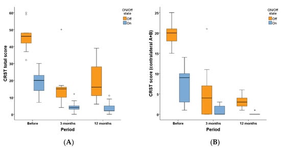 CRST scores before and after MRgFUS Vim ablation. (A) Total CRST score at ON and OFF state before and at three months and one year after unilateral Vim ablation by MRgFUS. (B) CRST (A + B) score of the contralateral limb at ON and OFF state before and at three months and one year after unilateral Vim ablation by MRgFUS. ◦ and * in the figures represent the outliers of the corresponding group. MDS-UPDRSIII: Movement Disorder Society Unified Parkinson’s Disease Rating Scale part III; CRST: Clinical Rating Scale for Tremor.