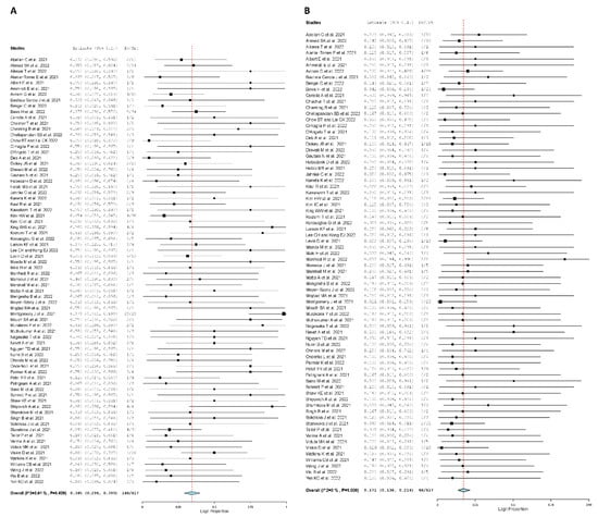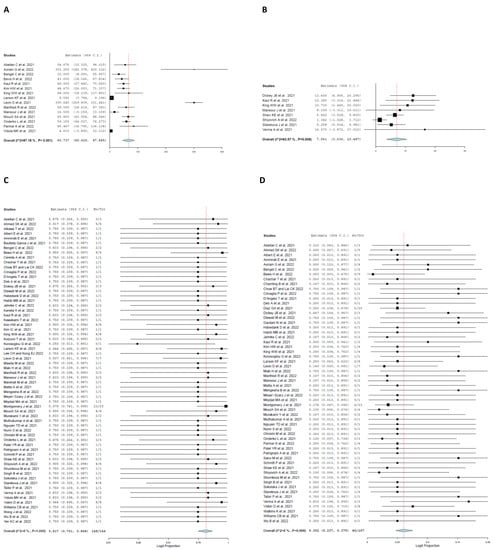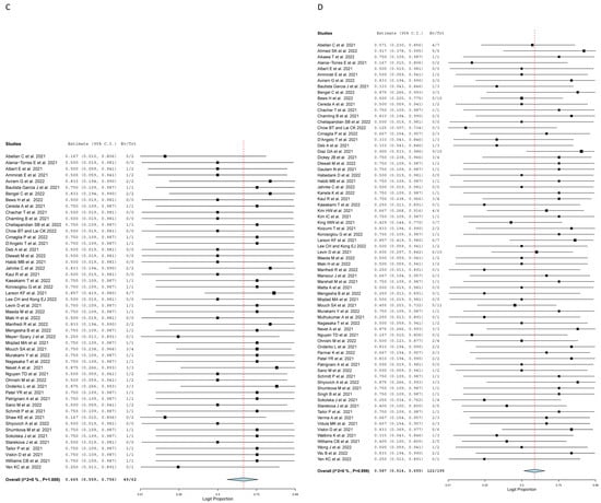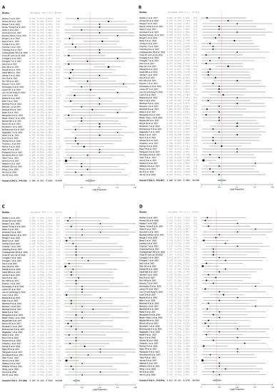 Forest plot of presenting symptoms. (A), Chest pain. (B), Fever. (C), Dyspnea. (D) Myalgia [16,19,20,21,22,23,24,25,26,27,28,29,30,31,32,33,34,35,36,37,38,39,40,41,42,43,44,45,46,47,48,49,50,51,52,53,54,55,56,57,58,59,60,61,62,63,64,65,66,67,68,69,70,71,72,73,74,75,76,77,78,79,80,81,82,83,84,85,86,87,88,89,90,91,92].