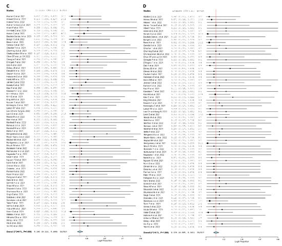 Forest plot of laboratory findings at time of admission. (A) C Reactive Protein. (B) Cardiac Troponin-I. (C) Elevated Troponin. (D) Left Ventricular Ejection Fraction Less Than 50% [16,19,20,21,22,23,24,25,26,27,28,29,30,31,32,33,34,35,36,37,38,39,40,41,42,43,44,45,46,47,48,49,50,51,52,53,54,55,56,57,58,59,60,61,62,63,64,65,66,67,68,69,70,71,72,73,74,75,76,77,78,79,80,81,82,83,84,85,86,87,88,89,90,91,92].