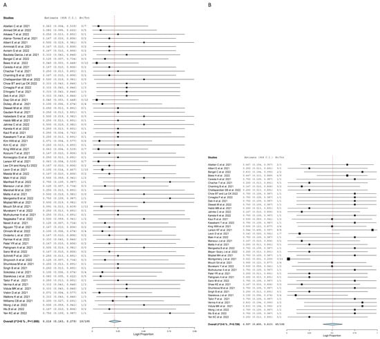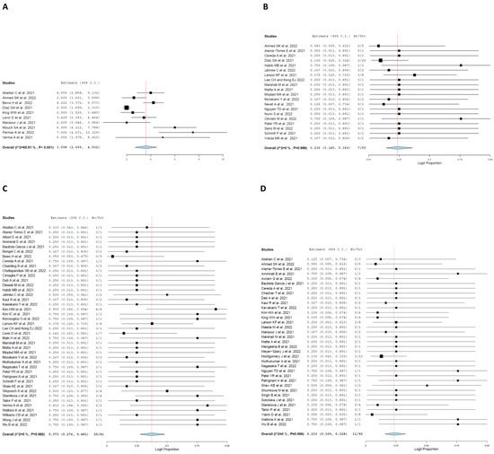 Forest plot of radiological findings at time of admission. (A) Arrhythmia. (B) Hypokinesis. (C) Myocardial Edema. (D) ST Changes [16,19,20,21,22,23,24,25,26,27,28,29,30,31,32,33,34,35,36,37,38,39,40,41,42,43,44,45,46,47,48,49,50,51,52,53,54,55,56,57,58,59,60,61,62,63,64,65,66,67,68,69,70,71,72,73,74,75,76,77,78,79,80,81,82,83,84,85,86,87,88,89,90,91,92].