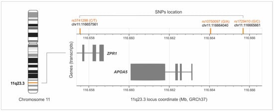 The multifactorial nature of coronary artery disease results from the influence of genetic and environmental factors. Several epidemiological studies show the role of lipid disorders in the development of atherosclerotic disease risk [1,2]. The 11q23.3 locus belongs to the regions associated with dyslipidemias. It includes, among others, four genes encoding apolipoproteins (APOA1, APOA2, APOA4, and APOA5) involved in cholesterol homeostasis and lipoprotein metabolism, and the regulatory gene ZPR1. Previous GWAS studies have identified the selected polymorphic variants of genes clustered in this region as possibly having significant associations with lipid disorders and coronary heart disease [3]. Moreover, the selected polymorphic variants of the 11q23.3 locus are associated with a high risk of cardiovascular events, the most common cause of morbidity and mortality in patients with rheumatoid arthritis [4,5].